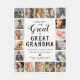 Personalized great grandmother picture blanket featuring the cute saying "you put the great in great grandma", 18 photos of the grandkids, their names, and the sweet caption "grandmas hold our tiny hands for just a little while, but our hearts forever".