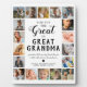 Personalized great grandmother photo plaque featuring the cute saying "you put the great in great grandma", 18 pictures of the grandkids, their names, and the sweet caption "grandmas hold our tiny hands for just a little while, but our hearts forever".
