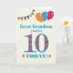 A colorful birthday card for a 10-year-old great grandson, The large number 10 filled with an orange, red and blue pattern, outlined in bright blue. There are balloons and bunting at the top, in matching colors and the front cover greeting is, 'Great Grandson, you're 10 today!' in bright red and blue lettering, on a very pale yellow and white polka dot background, with red and orange stars each side of the word 'TODAY!'. The inside message can easily be customized or deleted if you wish.