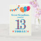 A colourful birthday card for an 13-year-old great grandson, The large number 13 is filled with an orange, red and blue pattern, outlined in bright blue. There are balloons and bunting at the top, in matching colours and the front cover greeting is, 'Great grandson, you're 13 today!' in bright red and blue lettering, on a very pale yellow and white polka dot background, with red and orange stars each side of the word 'TODAY!'. The inside message can easily be customized or deleted if you wish.