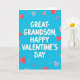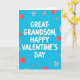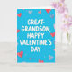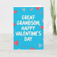 This Valentine's Day card features a bright blue background with lots of small hearts scattered all around. The hearts come in reds, pinks, light blues, and purples, with a mix of solid shapes and outlined ones. In the center, the message reads “GREAT-GRANDSON, HAPPY VALENTINE’S DAY” in large, rounded white letters that stand out clearly. A few tiny white dots sprinkled across the card look like confetti, adding a light, happy feel. One light blue heart has little dotted details and a tiny bug-like figure inside it, which makes the design feel extra sweet and thoughtful. The overall look is cheerful and affectionate, like a warm hug meant just for him. It’s a meaningful card to give because it says your love plainly while still feeling special 🥰❤️.
