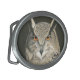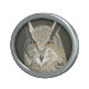 A color pencil and pen drawing of a Great Horned Owl with piercing orange eyes adorns this belt buckle!