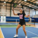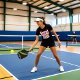 Funny pickleball ladies' t-shirt with huge pink-white slogan Great minds dink alike