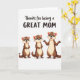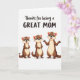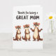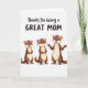 This card features three small, otter-like animals in a simple digital illustration, arranged like a close family group with an affectionate, together-at-home feel ❤️. They stand on a wide white background, with rich brown fur, creamy bellies, and soft pink inside their ears creating gentle contrast. The largest animal is centered and slightly forward, holding its front paws open as if inviting a hug, while the two smaller ones stand nearby with paws tucked in, leaning toward the bigger figure. Their round, shiny eyes and wide smiles suggest a tender bond and an easy closeness between them. Above the characters, the message “Thanks for being a GREAT MOM” is placed near the top in dark, friendly lettering, with “GREAT MOM” emphasized in larger text. The open space around the figures keeps the focus on their expressions, like a quiet moment of appreciation 🌼. Light gray shadows sit directly beneath their feet on the white ground.