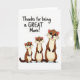 This greeting card features three slender, animal-like figures that resemble aquatic weasels, lined up from smallest on the left to largest on the right as if they’re growing together like close family ❤️. Their warm brown coats contrast with creamy bellies, and each one has a wide open smile, dark shining eyes, fine whiskers, and tiny noses and ears tinted soft pink for a gentle, affectionate look. The way they lean forward with matching grins suggests an easy closeness, like friends sharing a sweet inside joke. Across the upper area, the message “Thanks for being a GREAT Mom!” sits large and easy to read, with “GREAT” standing out in all caps. The lettering is dark and centered near the top, leaving plenty of space around it so the words feel clear against the plain white background. The background stays uncluttered and bright, with soft lighting that rounds the characters’ shapes without strong shadows 🌼. The three figures stand near the bottom portion of the card, evenly spaced in a left-to-right row beneath the text.
