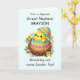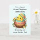 Celebrate Easter with your great nephew by making this card even more special with his name on the front! Featuring an adorable chick hatching from its shell, surrounded by colorful spring flowers, the design is full of life and perfect for the occasion. The soft pastel teal background creates a joyful vibe, while personalizing the front with his name adds a unique and memorable touch. Inside, a heartfelt message shares Easter wishes filled with love and happiness, creating a keepsake that he’ll cherish for years to come.