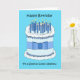 A giant birthday cake, iced in blue and white, and covered in several lit candles. The image has a turquoise background and is accompanied by the words 'Happy Birthday to a Special Great Nephew'.