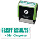 This motivating rubber stamp design features the positive message "GREAT RESULTS!" and a custom educator name. It could be used by a teacher, educator, or tutor when marking assignments, to acknowledge that the student has done well.