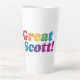 This t-shirt design features the iconic phrase "Great Scott!" in a fun, multi-color, and slightly retro font. The letters are bold and pop with a vibrant rainbow of colors, giving the design a playful and eye-catching feel. The text is the central focus of the design, celebrating the famous movie quote with a simple yet dynamic style