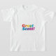This t-shirt design features the iconic phrase "Great Scott!" in a fun, multi-color, and slightly retro font. The letters are bold and pop with a vibrant rainbow of colors, giving the design a playful and eye-catching feel. The text is the central focus of the design, celebrating the famous movie quote with a simple yet dynamic style