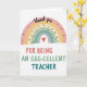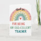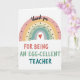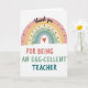 Designed with a soft pastel rainbow arch across the top, this card uses gentle bands of pink, pale yellow, mint green, and light blue, each dotted with small round accents in a deeper shade. Tucked into the inner curve sits a single bright red heart, like a quiet sign of affection between close friends. Beneath the arch, the words “thank you” appear first in a loose, flowing lowercase style, set in a darker tone that stands out against the white space. Below that, “FOR BEING AN EGG-CELLENT TEACHER” is arranged on three lines in rounded lettering, with each line shifting to a different coordinated color such as coral, soft green, and deep teal. The layout feels friendly and close, as if the heart above is watching over the message with a gentle nod. A light, grainy texture in the colored shapes adds warmth without looking fussy, and a small 🌷 or 🐰 detail fits naturally with the springtime mood. The white background stays open and airy, while the rainbow arc, dotted accents, and red heart draw the eye downward to the stacked text.