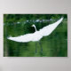 A beautiful Great White Egret in flight over a river with its wings stretched out wide.