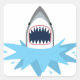 Cute cartoon of a great white shark leaping from the waves with its toothy jaws wide open.