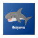 A happy, hungry great white shark is swimming in the ocean. Drawn in cute cartoon illustration style on a blue background for a fun day!