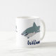 This coffee mug makes a great personalized gift for fans of sharks. It features an illustration of a great white shark and your own name or short message below in navy blue.