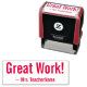 This positive rubber stamp design features the message "Great Work!" and a custom tutor's name. It could be used by a teacher, educator, or tutor when marking assignments, to acknowledge that the student has done a great job.