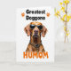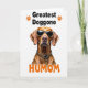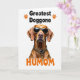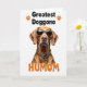 This card features a centered portrait of a short‑haired reddish‑brown dog on a bright white background, shown from the head down to the upper chest. Dark sunglasses with a spotted animal‑print frame sit across its face, giving it a cool, affectionate look, like it’s posing for someone it adores ❤️. Around its neck is a matching animal‑print collar with a small shiny gold charm that catches the light. The lighting is high and even, making the warm fur tones stand out while keeping the scene simple and airy. Near the top, black uppercase text reads “Greatest Doggone,” with two small orange paw‑print icons placed as accents beside the words. Near the bottom, the word “HUMOM” appears in rounded orange letters, adding a sweet, friendly tone 🌼. The two lines of text are aligned above and below the dog, framing the portrait against the white space with the orange paw prints and orange bottom word clearly visible.