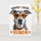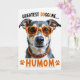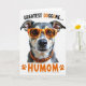 This card features a close-up portrait of a friendly dog centered on a bright white background, looking straight out with a tender, loyal gaze that feels like a quiet “I adore you” ❤️. The dog wears orange-framed glasses that add a sweet, smart look, and the lenses catch the light to make the eyes feel extra lively. Its coat mixes deep charcoal, creamy white, and warm caramel patches, with fine fur details that soften the whole scene. Around its neck is a patterned collar in black and orange that echoes the glasses and adds a fun, cozy touch. Near the top, the text reads “GREATEST DOGGONE...” in strong, dark lettering that stands out clearly against the white space. Near the bottom, “*HUMOM*” appears in a darker tone, with small paw-print icons on either side for a gentle, affectionate accent 🌼. The orange accents pop against the neutral fur colors, and the crisp lighting highlights the glasses, collar pattern, and individual fur strands on the dog’s face.