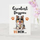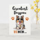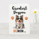 This card shows a fluffy dog in black, white, and tawny fur sitting neatly at center, facing forward with an open-mouthed grin and tongue out, like it’s sharing a friendly joke ❤️. The dog wears oversized sunglasses with a spotted pattern, giving it a confident, buddy-like attitude that feels inviting rather than distant. Around its neck is a shiny gold chain with a small rectangular tag that carries a short, command-style word. At the top, deep black lettering spells out “Greatest Doggone,” arranged in a smooth, flowing style across the white space. Near the bottom, thick rounded letters in orange with black accents read “HUMOM...” and sit wide beneath the dog’s paws. Two simple orange paw-print icons flank the dog on the left and right, adding a cozy pet-and-person closeness 🌼. The background stays bright white so the fur colors, orange icons, and dark text stand out clearly, and the sunglasses catch the eye with their dotted pattern. The fur is drawn with soft texture while the necklace, paw prints, and lettering look crisp and graphic against the plain white background.