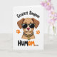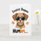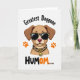 This greeting card features a light-brown cartoon dog with floppy ears standing in the middle of a white background, wearing animal-print sunglasses with dark lenses and a matching collar that gives it a cheeky, confident look ❤️. A small golden ring hangs from the collar with a yellow tag that reads “bad,” hinting at mischief while still feeling lovable. Above the dog, the words “Greatest Doggone” appear in angled black lettering across the top area. Below the character, “HUMOM...” sits near the bottom, with “HU” in black and “MOM...” in orange, and the trailing dots suggest a lingering, affectionate pause. The dog’s soft pink nose and warm shading add a tender touch, like it’s posing proudly for someone it adores. Two orange paw prints sit to the left and right of the dog’s head, like little cheers from a loyal companion 🌼. The sunglasses have a spotted pattern, and the paw prints are bright orange against the plain white space.
