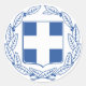 The coat of arms of Greece displays a white cross on a blue escutcheon, which is surrounded by two laurel branches.