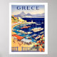 Greece Travel poster show fishing boats in port, with promenade by the sea, and the mountains in the distance.