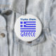 Personalized button pin featuring the Greek flag and the word, GREECE, below in blue. The flag shows blue and white stripes with a blue and white cross in the upper right area. Above it, add a name for a personalized touch to a stocking stuffer gift. Fun to wear at family reunions.