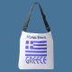 Personalized crossbody bag features the Greek flag and the word, or name GREECE below in blue. The flag shows blue and white stripes with a blue and white cross in the upper right area. Above it, add your name for a personalized touch or create a gift. Fun for family reunions. Great for celebrating Oxi Day.