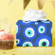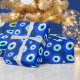 Colourful blue and white patterned wrapping paper, featuring the symbolic Greek Eye. Proclaimed to be a protection from evil. Seen throughout many countries including Greece and Turkey.