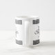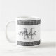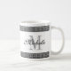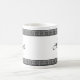 Greek key meander pattern border custom monogram coffee mug. Create your own monogrammed cup with stylish black and white fret and classy script typography. Cute Birthday gift or wedding party favor for men, women, friends and family. Custom drink ware for home, office, work, restaurant, school etc. Also available as large oversized mugs and big to go travel mugs. Make one for bride and groom, teacher, nurse, boss, co worker, best friend, mom, dad, uncle, grandma, grandpa etc.