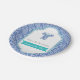Greek key pattern and blue, aqua column Grecian wedding paper plate featuring a frame with blue and aqua outline, a border of Greek key or Meander or Greek fret pattern in blue and white, a turquoise banner and a blue, aqua Greek column. Text in grey. This elegant, modern design with vintage and ancient elements is perfect for a Greek and/or Grecian wedding theme regardless where it takes place in Greece or elsewhere, a bridal shower, reception, engagement, or anniversary party.