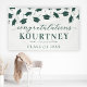 Modern graduation party banner featuring a simple white background that can be changed to any color, falling green mortarboard caps, and a congratulations text template that is easy to personalize.