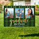 Announce to the world that your favorite grad has reached their milestone. Everyone who passes by will not be able to miss this stunning, simple, modern, personalized 3 photo yard sign. Sparkly faux gold glitter handwritten script overlays a hunter green striped background. Add 3 photos of your choice and personalize the custom text with your graduate’s name, school name and class year. Choose from 3 sizes: small (12”x18”), medium (18”x24”) and large (24”x36”). Matching invites, thank you cards, cap toppers, fans, napkins, plates and other graduation goodies are also available in this trendy and stylish collection. Guaranteed to preserve cherished memories of their special occasion!