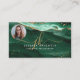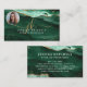 Modern, stylish professional business card with green agate and marble with faux gold glitter veins and sparkle accents personalized with fancy handwritten script monogram initials with swashes and name and your photo. ASSISTANCE: For help with design modification or personalization or if you would like coordinating items, contact the designer BEFORE ORDERING via the Zazzle Chat MESSAGE tab or email makeitaboutyoustore@gmail.com.