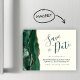 This elegant save the date magnetic card features an emerald green watercolor agate border trimmed with faux gold glitter. The customizable text combines green handwriting script, copperplate and italic fonts on an ivory background.