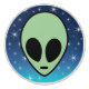 A green alien head with big black oval eyes and a small black slit for a mouth. The background is a dark to light blue gradient colour dotted with white stars.