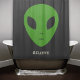 A black Shower Curtain with a green alien head and a customizable message "Believe"! Perfect for a geek bathroom decoration!