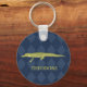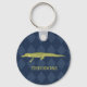 Create a small personalized gift that's perfect for someone who loves alligators and other animals. This keychain has a realistic style illustration of an alligator in an olive green color set against a navy blue patterned background and is ready to be personalized with a name in matching olive green lettering.