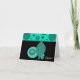 A whimsical design featuring a green leaf and seed pods on a black background. A border of dots in similar colors accents the top of card.