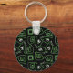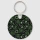 A tribal looking repeating pattern of stylized green lizard heads with eyes wide open on a black background.