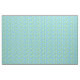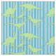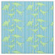 Blue and white stripes, with a pattern of dinosaurs on it. The dinosaurs are done in green and white.