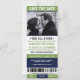 Sports ticket themed save the date invites are cool and fun! They look like a sports ticket to celebrate the event of the season. Color palette in blue and green. Contact for custom colors.