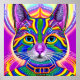 Cool robot steampunk kitty cat with mystical blue eyes and colorful fur psychedelic AI generated art stickers.