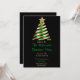 A green and gold christmas tree on a black background. The back of the invite is black with snow pattern