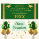 Personalized Green and Gold Class Reunion Banner or Graduation Banner. Type in Your Text into the 3 Text Box Templates by Clicking "abc Personalize this Template". CALL Designer Linda: 239-949-9090 or you can, CHANGE the Green and Gold, background and text COLORS. Designer Linda can change the graduation caps and sports stripes to any color combination.