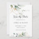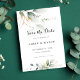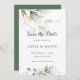 Elegant Save the Date wedding invitations featuring a nature, gold and green watercolor leaves design, and a leafy, foliage, botanical celebration of life template that is easy to personalize.