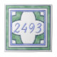A hand drawn light blue and green frame around a green house number with dark blue outlines and a pattern in the corners.