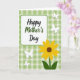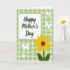 This card features a central white panel with softly rounded corners, edged by a thin green outline, setting a gentle, caring tone ❤️. The message “Happy Mother’s Day” sits centered on the panel, with “Happy” and “Day” in black flowing lettering and “Mother’s” in deep green for a sweet emphasis. A bright yellow flower rises from the lower right, its sunny petals circling a warm brown center like a friendly face turned toward you 🌼. Two broad green leaves tuck around the stem, giving the bloom a protective, nurturing feel, like a quiet hug in picture form. Behind everything, a light green-and-white checkered background adds a cozy, kitchen-table warmth that hints at close family moments. Four small white butterfly shapes drift across the scene, as if floating between the words and the flower in a soft, affectionate dance. The butterflies appear as pale cutouts with simple wings, scattered across the gingham pattern.