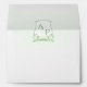 Return Address envelope design. The liner features a light green and white Greek Key pattern with a watercolor wedding crest decorated with white hydrangeas. All watercolor elements originally handpainted by me before being scanned into digital form. The reverse flap has the name/ return address in green, and a smaller version of the crest.