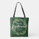 Beautiful bridesmaid gift for your tribe. This tote bag features a Boho light green wreath on a deep green background. Bridesmaid is written across it in a bright white modern script. The bridesmaid name is above and the bride's name and wedding date is below.